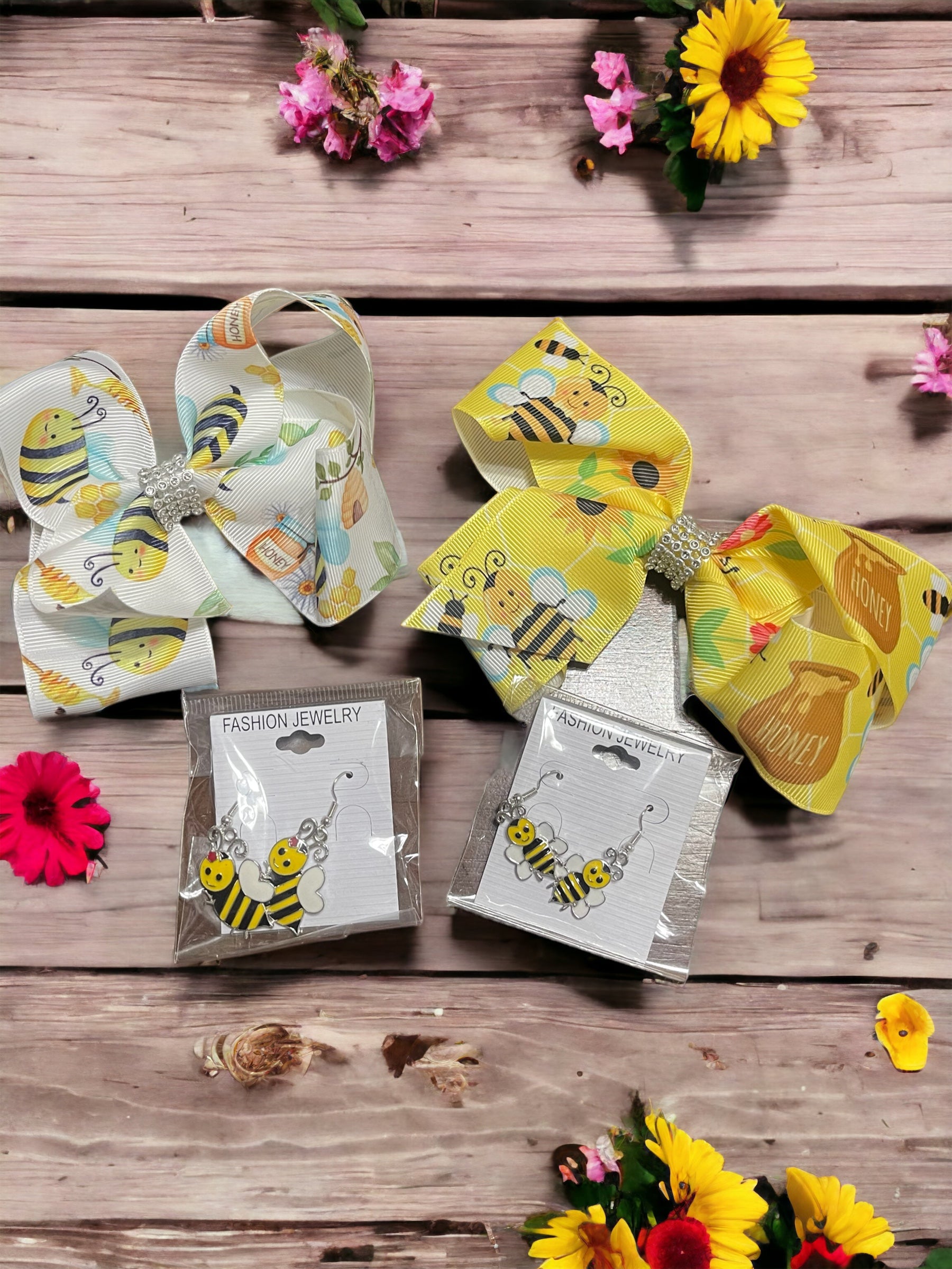 One Yellow or White hair bow and one pair of bee earrings.